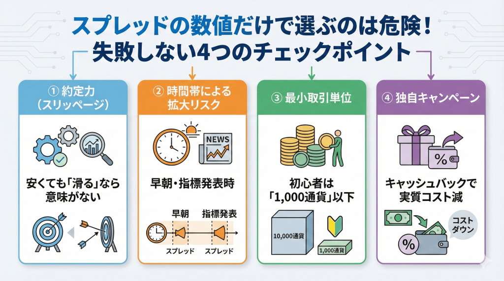 「公式サイトのスプレッドは0.2銭だったのに、実際はもっとコストがかかった」という失敗を防ぐために、以下の4点を必ずチェックしてください。
