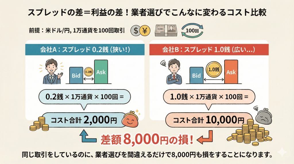 例えば、米ドル/円のスプレッドが「0.2銭」の会社と「1.0銭」の会社で、1万通貨を100回取引したとしましょう。